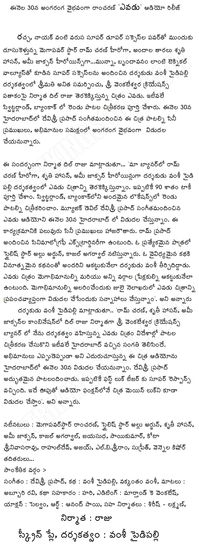 search terms : yevadu audio release date , film release date , shooting details , cast and crew , pressnote , official news , audio release details , venue , event details , songs release , cast and crew.